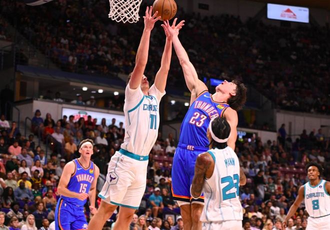 北京时间10月6日,NBA季前赛继续展开,卫冕冠军雷霆对阵黄蜂。本场比赛雷霆首发五人全都缺席,可上来他们状态十分火热,两队防守强度也不大,维金斯帮助球队占据主动,半场领先13分;下半场雷霆延续火热的状态,完全压制着黄蜂,将分差拉开到20分以上。最终,雷霆135-114大胜黄蜂,取得了季前赛的开门红。