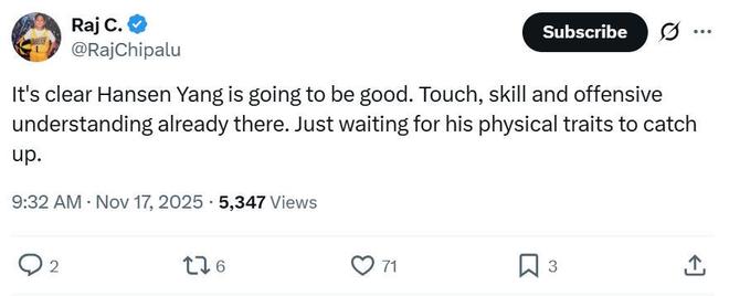 另外一位湖人记者Raj Chipalu给出相同的看法:“杨瀚森未来可期!他已经拥有出色的球感、技术与进攻意识,万事俱备,仅差身体素质了。”