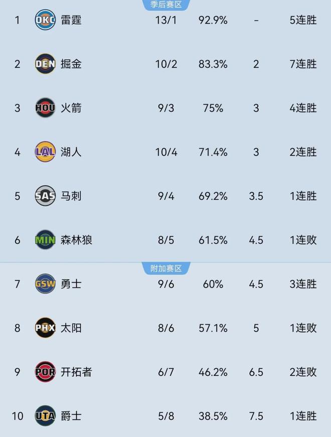 在文班亚马带领下,马刺本赛季开局一度很是亮眼打出了5连胜,目前以9胜4负排名西部第五,如今随着前者要高挂免战牌一段时间,战绩可能将急转直下,西部第六森林狼&西部第七勇士仅落后他们1个胜场,西部第八太阳则落后1.5个胜场。